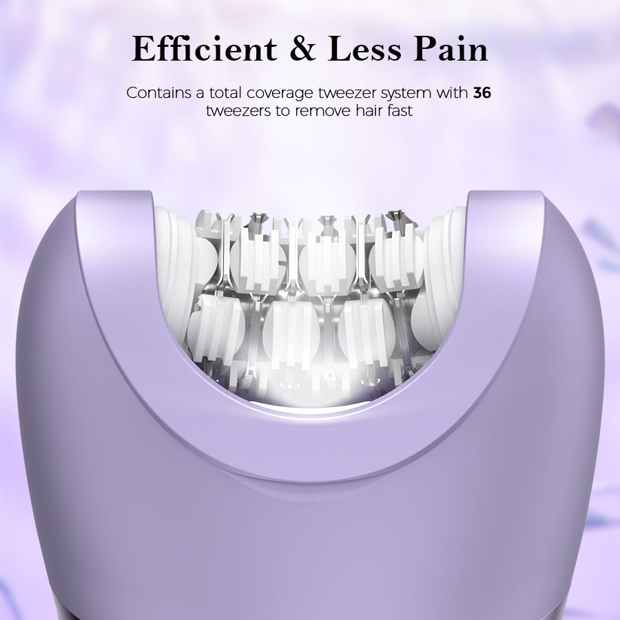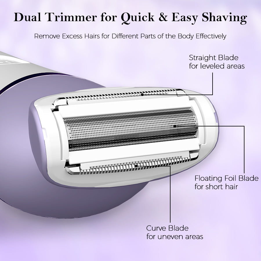 The epilator comes with a dual-function design: the epilator gently removes hair from the root for long-lasting smoothness, while the razor head is perfect for quick and easy shaving when needed.